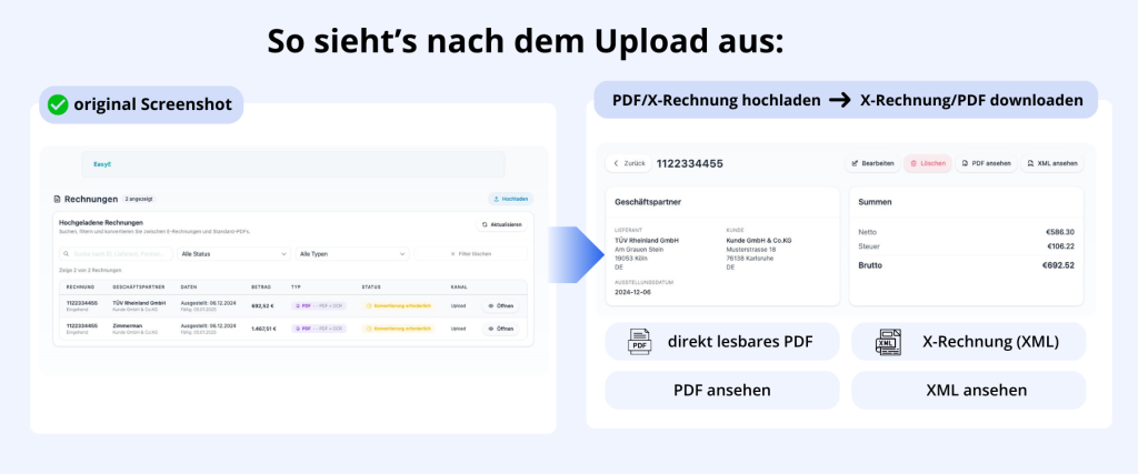 E-Rechnungen werden oft als XML bereitgestellt. Ohne lesbare Darstellung ist die Kontrolle von Inhalt und Beträgen unnötig aufwendig.